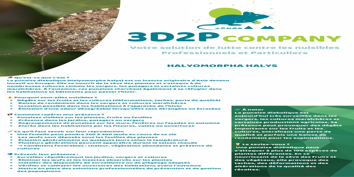 La société 3D2P COMPANY, spécialisée dans la gestion des nuisibles, met en place des solutions adaptées pour surveiller et contrôler la présence des punaises de jardin, permettant de protéger durablement les plantations, les cultures et les espaces extérieurs.